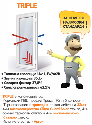 - Стакло: 4-16-4-16-4 нискоемисионо К стакло + обично + високоенергетско clima guard solar стакло (исполна Аргон)